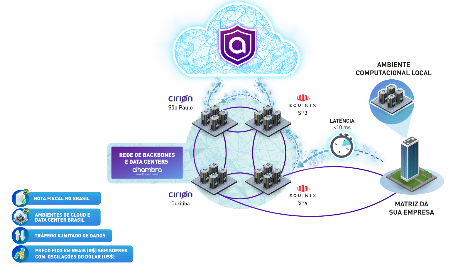 Traga seu Cloud para Alhambra, economize e não se preocupe mais com oscilação do dólar. Oferecemos contrato fixo em reais e nota fiscal no Brasil. Mantenha os seus dados protegidos com tráfego ilimitado e armazenados nos maiores Data Centers do Brasil.